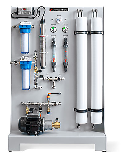 Компактните системи за обратна осмоза на FINESTFOG се характеризират с открит дизайн и високото качество на изработка. Системите произвеждат между 100 и 900 литра чиста вода на час. (Предлагат се по-големи капацитети при поискване). Модулът за осмоза FINESTFOG е в основата на системата за пречистване на водата. Неговата висококачествена композитна мембрана е предназначена за висока ефективност и дълъг експлоатационен живот. Отвореният дизайн на устройството улеснява мониторинга на производителността. Дебитомерите за пермеат и концентрат (отпадъчна вода) предоставят информация за ефективността на работа. Сензорът за проводимост осигурява най-високото качество на водата. Всички операционни параметри могат да се наблюдават на цифров дисплей. При системите за обратна осмоза не съществува риск водата да бъде повторно замърсена, защото това е затворена система с малък буферен резервоар. Интегрираната система за UV стерилизация в края на процеса дава двойна гаранция, че в третираните води няма останали микроорганизми.